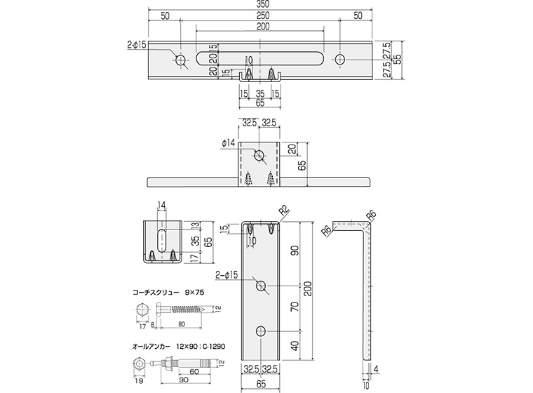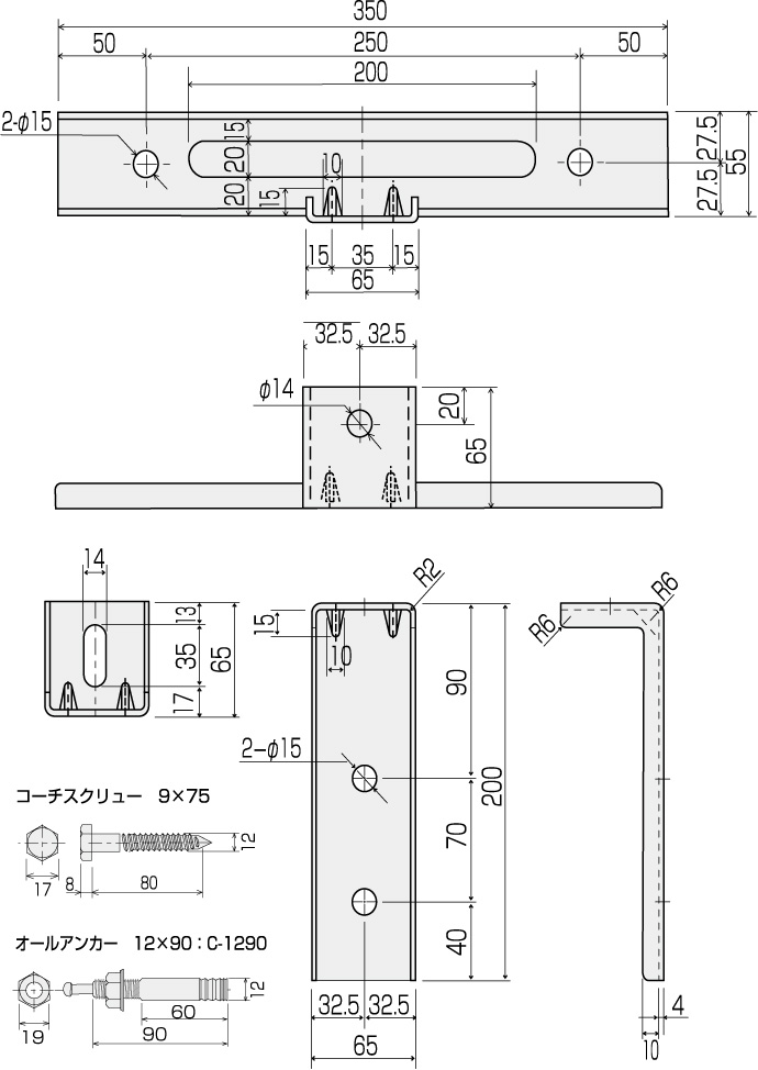 | 付属部品 | M-12オールアンカー(2本/枚)コーチスクリュー(2本/枚)ナット、平座金、スプリングワッシャー、六角ボルト(2/枚)、モスグリーンゴムパッド付 |
