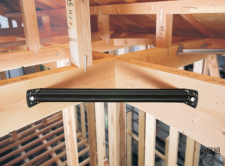 小屋束と小屋梁をしっかりと緊結、縦・横・斜めのネジレを防ぎます。