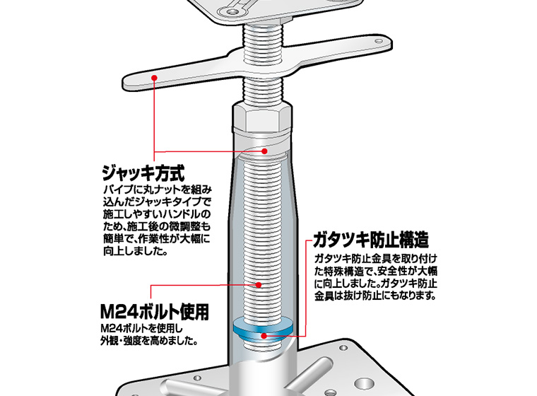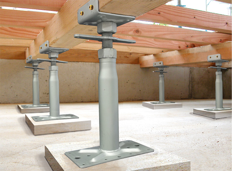 - 耐食性に優れたダクロ処理/高級クロムメッキ仕上げで、木製の床束の様にシロアリの被害や腐朽菌による被害もありません